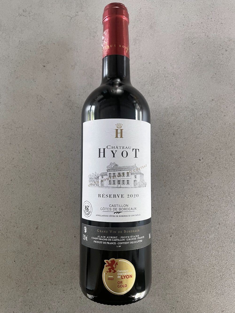 La famille Aubert, qui dirige notamment le Château La Couspaude (Grand Cru Classé de Saint-Emilion), exploite 300 hectares et de nombreux domaines viticoles dans le Bordelais. Alain, l’un des trois frères à la tête du groupe familial, porte le Château Hyot en son nom. Le millésime 2020 a donné naissance à un vin à la robe rubis pourpre qui offre un très beau bouquet ainsi qu’un beau fruité généreux et pleinement épanoui. Le vin est rond et sensuel avec une belle longueur en bouche. Racé et harmonieux, ce Castillon – Côtes de Bordeaux est une délicieuse réussite !